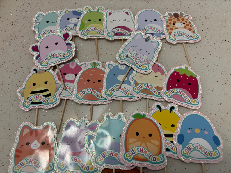 Featuring iconic Squishmallows designs, these toppers showcase vibrant colors and fun, playful characters sure to spark joy at any event. Whether it’s unicorns, cupcakes, or lovable animals, these toppers are designed to make your cupcakes stand out.