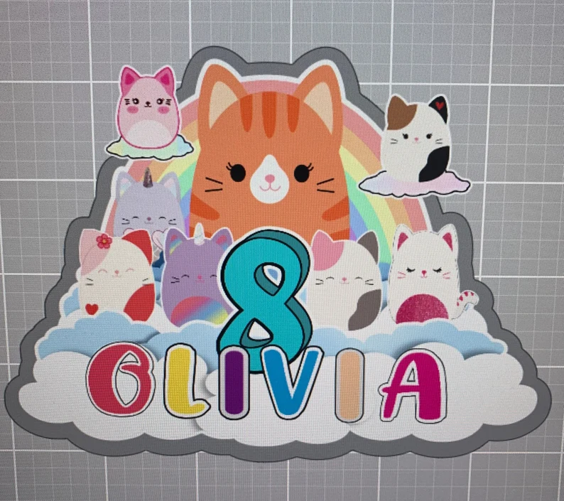 Transform any birthday cake into a dazzling centerpiece with our Personalized Squishmallow Glitter Cake Topper. This vibrant and customizable decoration is perfect for girls who love the cuddly charm of Squishmallows and a sprinkle of sparkle on their big day. Whether it’s her favorite character or a unique design that matches the party theme, this topper is crafted to bring joy to the celebration.