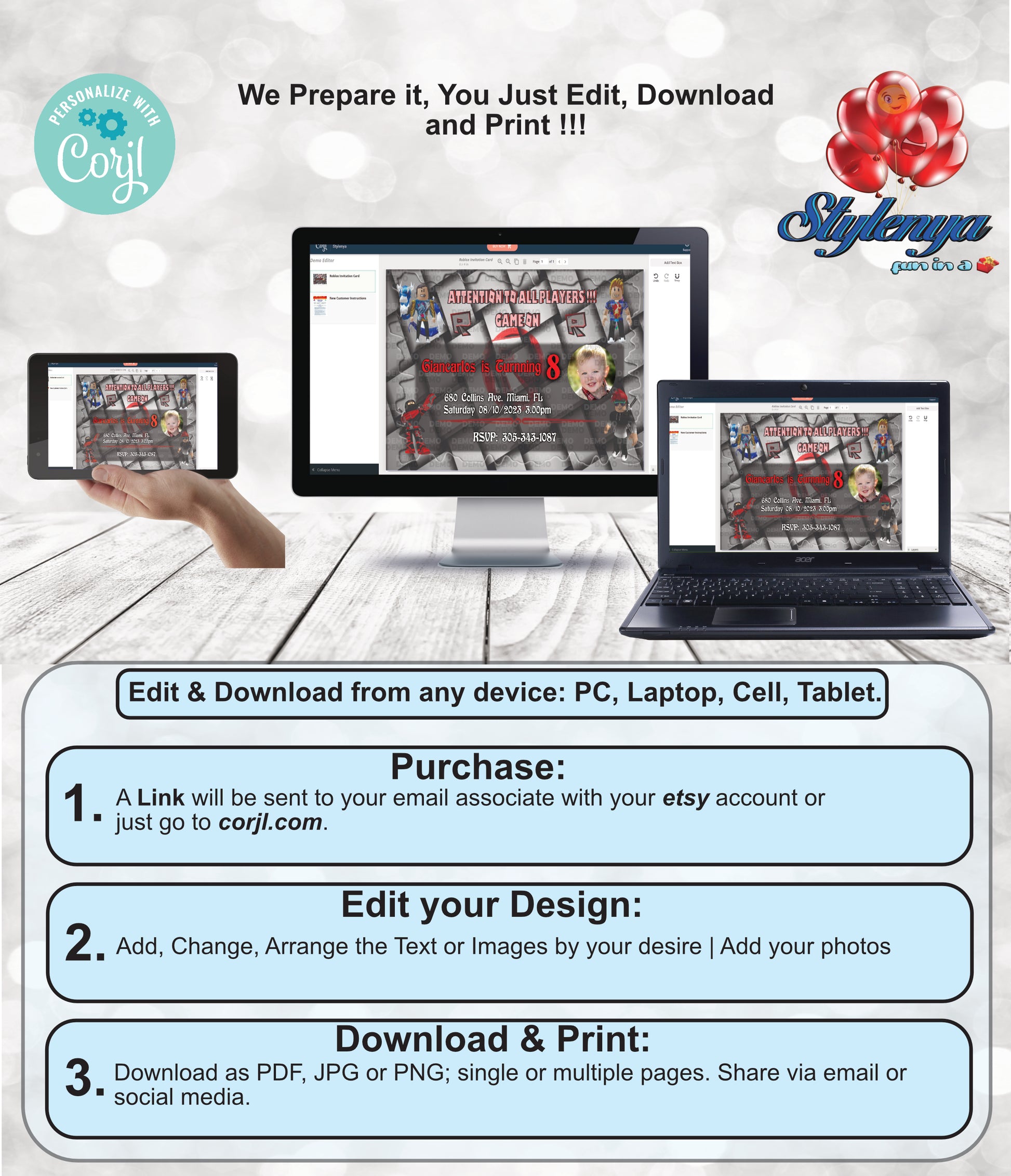 Tarjeta de invitación para fiesta de cumpleaños de gamers boy, editable e imprimible, digital