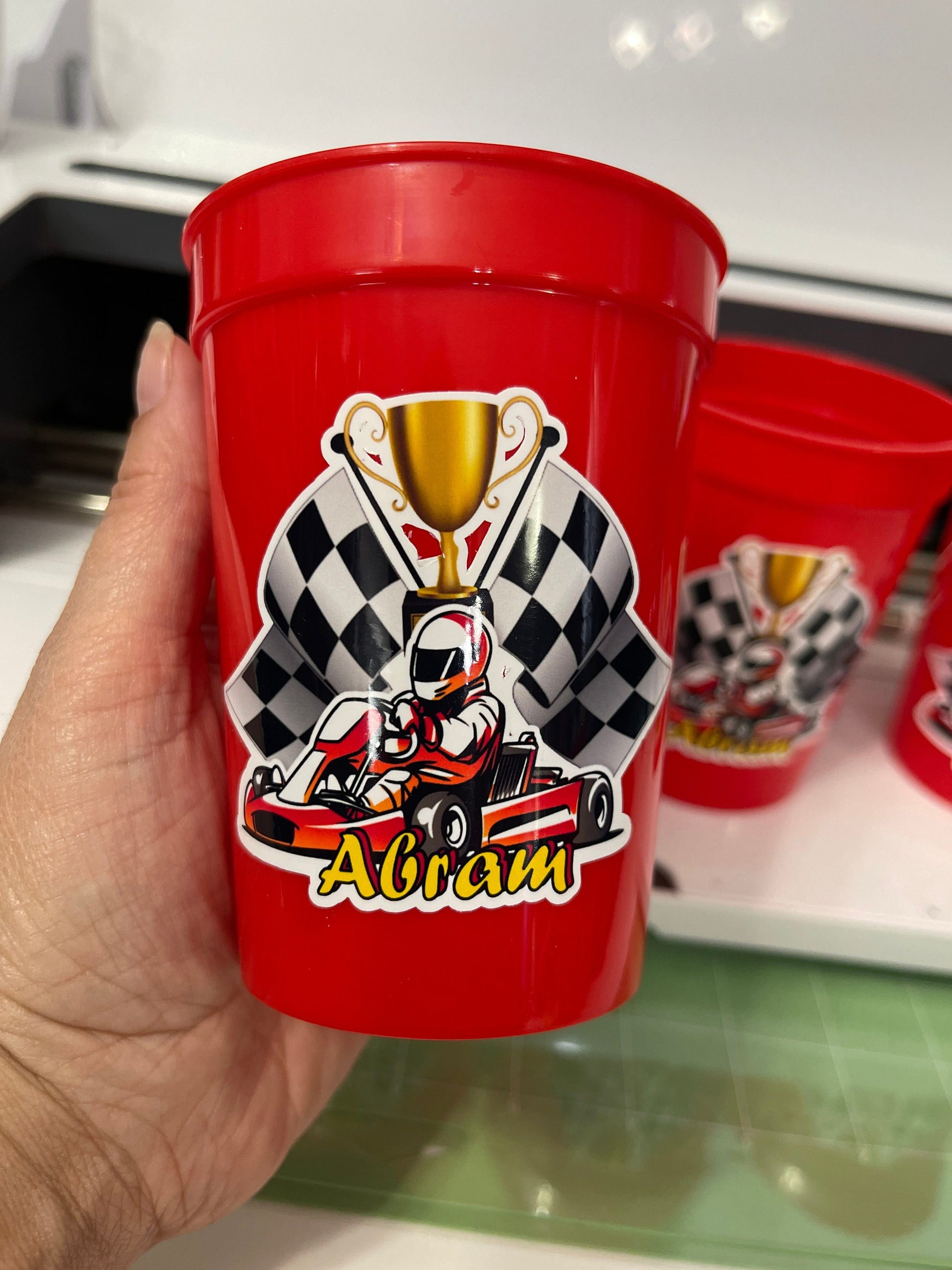 Our Red Plastic Stadium Cup for Racing Birthday Party for Boys have a durable glossy vinyl sticker with a perfect finish for your party.